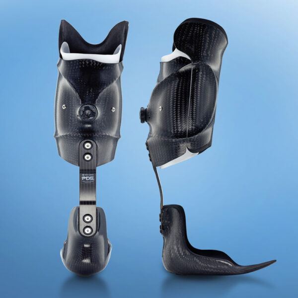 A custom PDE (Posterior Dynamic Element) strut ankle–foot orthosis is a bespoke device designed to provide dynamic dorsiflexion assistance and controlled energy return during walking. The strut is positioned posteriorly and is custom-manufactured to match the individual’s weight, activity level, and biomechanics. It is worn inside the shoe and combined with a custom footplate and calf section. The rear strut can be made in different flexibilities depending on the user's presentation.
